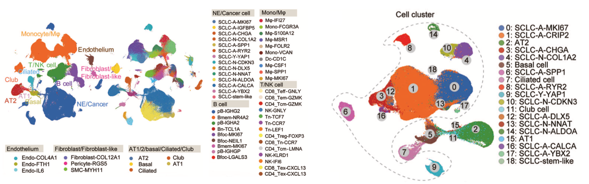 scRNA-seq鉴定了7种主要细胞类型和58种细胞亚型,包括内皮细胞、成纤维细胞/成纤维细胞样细胞、肺泡I/II型(AT1/2)/基底/纤毛细胞、神经内分泌(NE)/癌细胞、巨噬细胞(Mφ)/单核细胞、B细胞和T/NK细胞。研究者首先分析了免疫细胞特征,发现了27例未治疗肿瘤中,19例免疫细胞比例<10%,7例为10-50%,1例>50%,说明了免疫微环境的异质性。研究者后续对巨噬细胞、B细胞和T/NK细胞进行了更加深入的分析。其次研究者解析了癌细胞的异质性,鉴定了14种癌细胞亚型,其中C1(SCLC-A-CRIP2)和C0(SCLC-A-MKI67)是最主要的癌细胞群体,C1占所有癌细胞的52.94%,C0占21.44%。在治疗后,C0被完全消除,但是C1仍会部分保留,暗示了C1与耐药和复发的潜在关系。除此之外,研究者还发现了一类表达干细胞特征标志物的一群癌细胞C18,这群细胞占所有癌细胞的0-25.78%,富集MYC靶标和WNT-β-catenin通路基因,抑制细胞周期G2M检查点和p53通路。