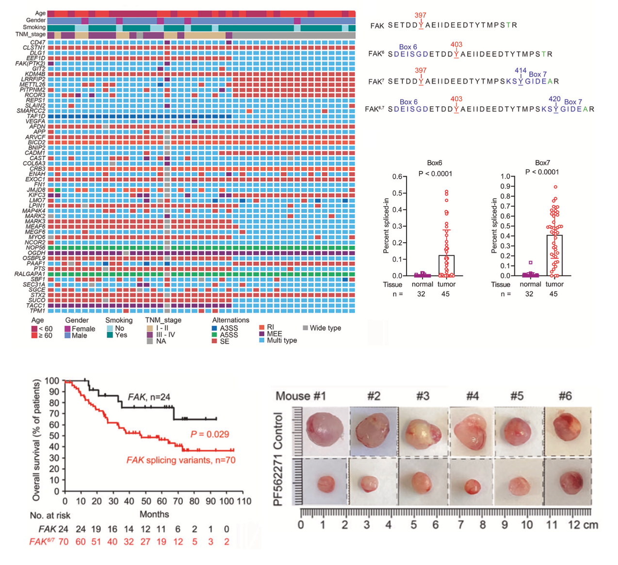 研究者分析了bulk转录组学,发现了高频选择性剪接事件。在45例SCLC样本中,18,268个基因(82%)表现出选择性剪接事件(ASEs),最重要的发现是FAK(PTK2)的剪接变体。研究发现了FAK剪接变体在154例SCLC患者中的119例(77.3%)存在,总共产生三种变体:FAK6、FAK7和FAK6,7。研究验证了FAK变体在不同SCLC癌细胞亚型中的分布,分析了FAK剪接变体与较差预后显著相关。体外和体内实验显示了FAK抑制剂PF562271对FAK6,7细胞系的抑制效果显著优于野生型FAK细胞。在患者来源类器官(PDO)、异种移植(PDX)模型和H82异种移植小鼠模型中,PF562271都显示了对肿瘤的显著抑制效果。