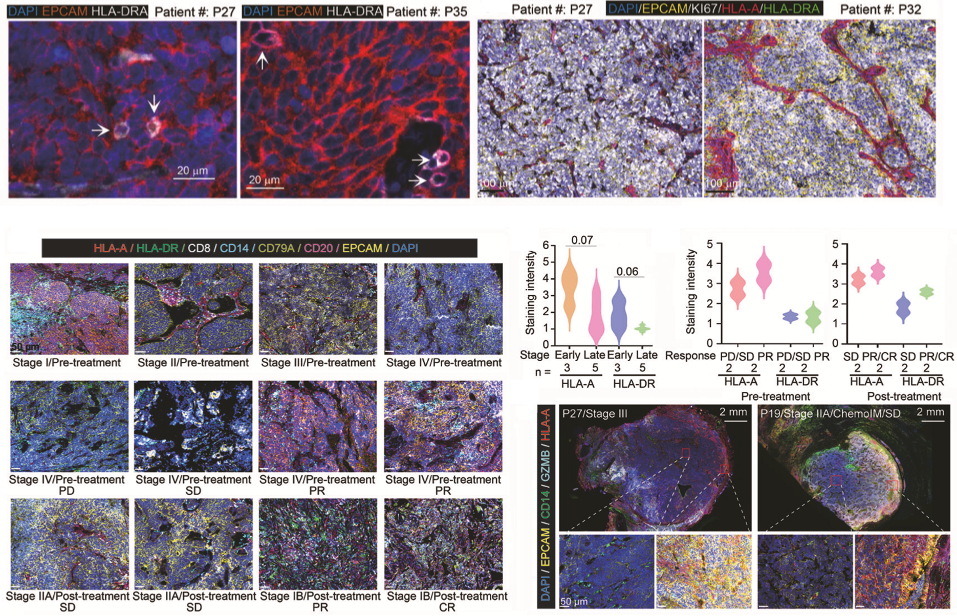 研究者重点关注了癌细胞上MHC分子的表达,scRNA-seq发现了MHC分子在癌细胞上的表达也存在明显的异质性,MHC-I(HLA-A、HLA-B、HLA-C)在6个癌细胞簇中低表达,5个簇中高表达,MHC-I高表达簇占所有SCLC癌细胞的10%左右。PCF空间单细胞蛋白组学组织原位上验证了EPCAM+癌细胞中也表达HLA-A和HLA-DRA。并且EPCAM+Ki67+癌细胞中几乎不表达HLA-A和HLA-DRA。scRNA-seq也证实了MKI67基因和MHC分子表达呈现显著负相关。PCF空间单细胞蛋白组分析揭示了早期患者肿瘤组织中的HLA-A和HLA-DR水平均高于晚期患者。治疗前癌细胞中HLA-A/HLA-DR表达水平较高的患者对新辅助治疗的反应更佳,且应答者中的HLA-A/HLA-DR表达水平显著高于无应答者。位于核心区的癌细胞HLA-A表达较弱,而位于肿瘤边缘的癌细胞表达强且周围有免疫细胞浸润。