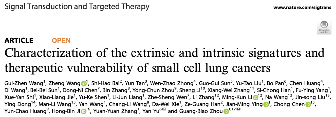 Wang GZ, Wang Z, Bai SH, Tan Y, Zhong WZ, Sun GG et al.Characterization of the extrinsic and intrinsic signatures and therapeutic vulnerability of small cell lung cancers.Signal Transduct Target Ther. (2025) 10:290.
