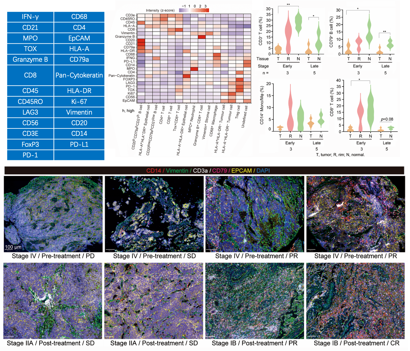 | 免疫微环境的空间解析为了解析肿瘤微环境的空间图谱,研究者进行了PCF空间单细胞蛋白组研究,总共检测了25种抗体。PCF空间单细胞蛋白组实现了全切片成像,细胞分割之后分析了百万级细胞,诠释了多种免疫细胞亚型。PCF分析发现了肿瘤组织中浸润免疫细胞少于癌旁肺组织,早期SCLC患者肿瘤中含有更多Granzyme B+CD8+ T细胞,治疗后CR/PR患者中这些免疫细胞数量高于SD患者。