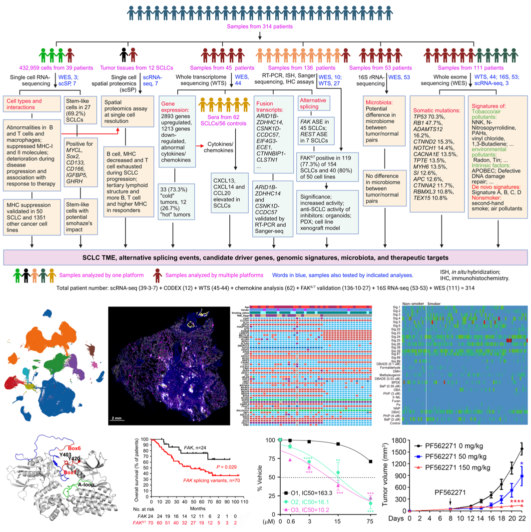 小细胞肺癌(SCLC)是一种高度侵袭性的神经内分泌肿瘤,占所有肺癌病例的15%。SCLC与烟草致癌物暴露密切相关,具有早期扩散和预后差的特点,5年总生存率不足7%。尽管已知SCLC中存在TP53和RB1等抑癌基因的功能丧失突变,但高频功能获得性致癌基因突变鲜有报道,且肿瘤内异质性(ITH)以及肿瘤免疫微环境(TEM)图谱尚未完全阐明。近期,中国医学科学院肿瘤医院周光飚研究组在《Signal Transduction and Targeted Therapy》发表题为“Characterization of the extrinsic and intrinsic signatures and therapeutic vulnerability of small cell lung cancers”的研究。该研究通过对314例SCLC患者样本进行多组学分析,包括单细胞RNA测序(scRNA-seq)、bulk RNA测序、全外显子测序(WES)、16S rRNA基因测序、PhenoCycler-Fusion(PCF)空间单细胞蛋白组等,系统性地描绘了SCLC的分子特征,并发现了FAK剪接变体这一潜在治疗靶点。(华盈生物为该研究提供了PCF空间单细胞蛋白组检测服务)